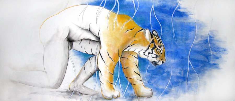 The tiger is a mystical and powerful creature in the Hmong culture. This drawing reflects Hmong folktales of tigers transforming into humans and humans into tigers. Mediums used are graphite, chalk pastels, and white conte crayons on stongehenge paper. Created: 2012 Professor: Tamara Brantmeier